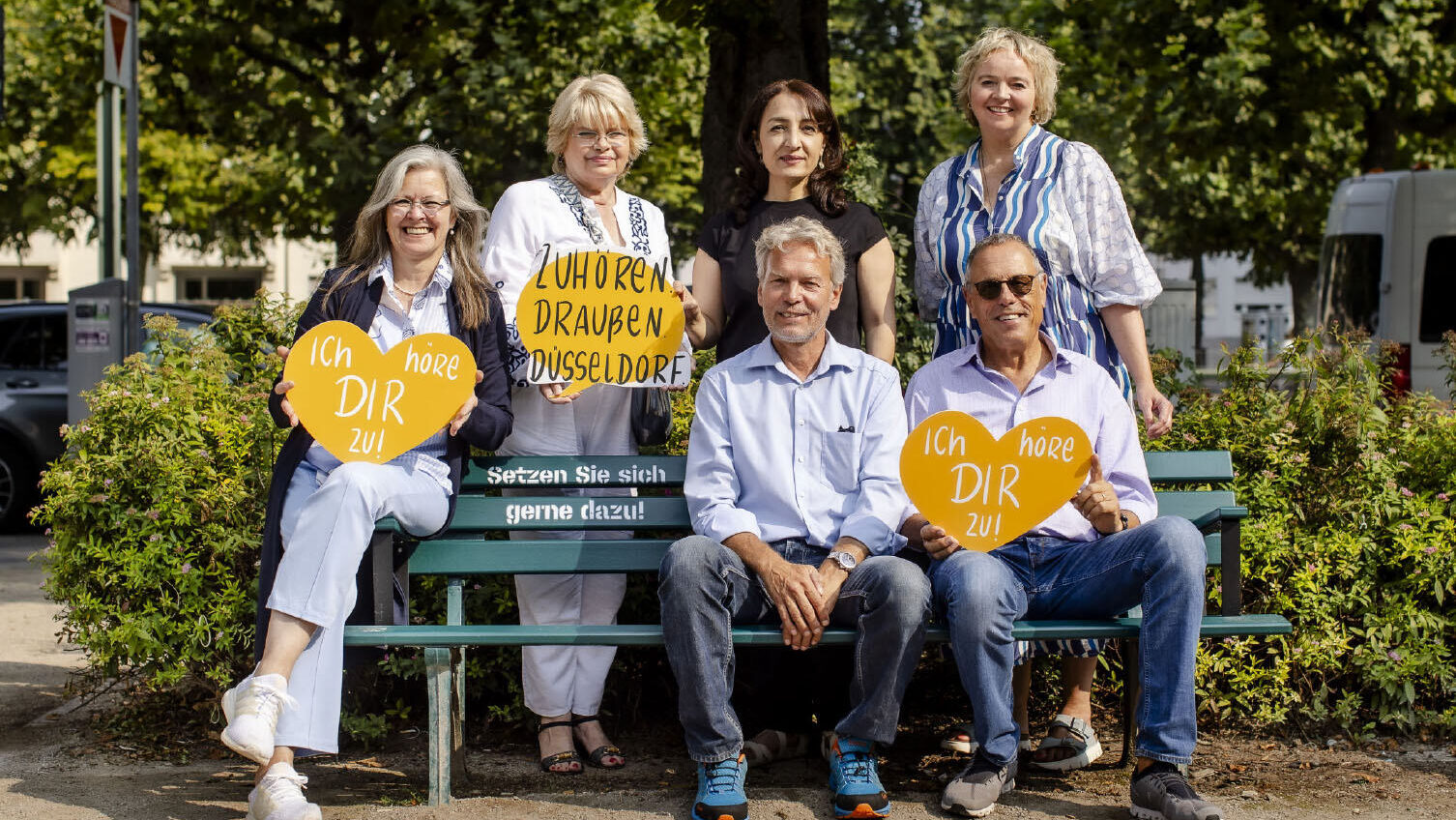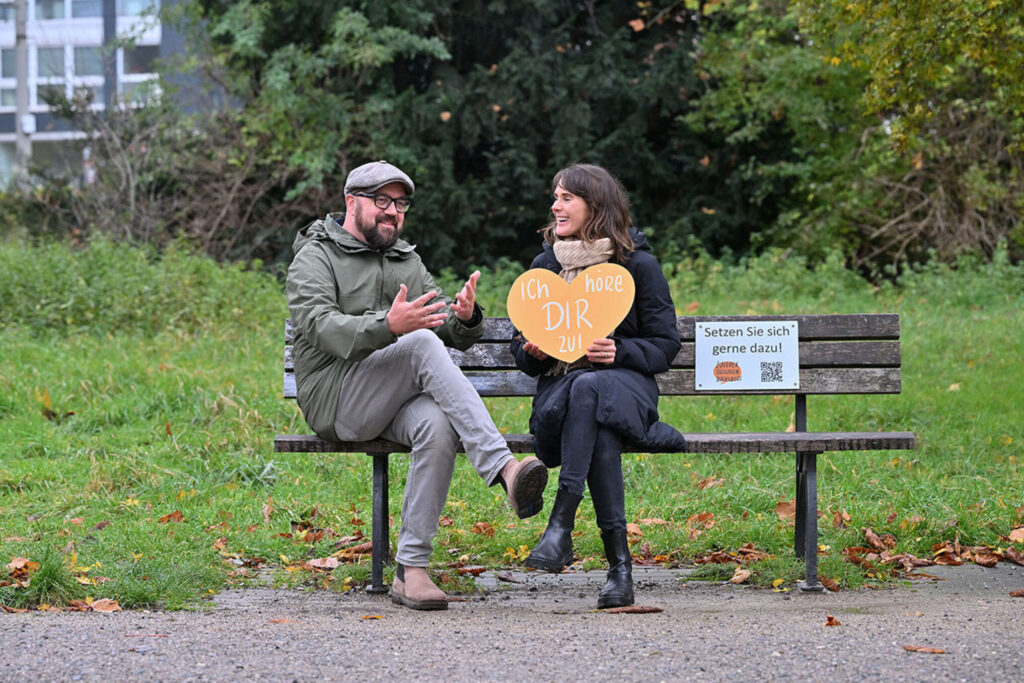 Our listening.benches in public spaces invite people to strike up conversations with each other. They create spontaneous encounters and offer everyone a place where they can be listened to openly and respectfully. There are 16 listening.benches in Düsseldorf, spread across various districts, which were established in cooperation with local initiatives, stakeholders, and associations from the respective district councils. We are constantly growing: thanks to our initiative, there are now listening benches in 15 other German cities.