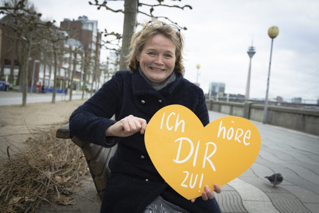 „zuhören draussen bewirkt bei den Menschen die Möglichkeit, ein Gegenüber zu haben, das ihnen tatsächlich zuhört. Denn es gibt in Düsseldorf viele Menschen, denen genau das fehlt. Man denkt immer In einer Großstadt ist das so viel Leben, da wohnen so viele Menschen miteinander, aber die wohnen eben auch sehr oft nebeneinander. Und es gibt, das weiß ich aus meiner Arbeit, viele Einsame, die sich sehr darüber freuen, dass sie sich öffnen können.“